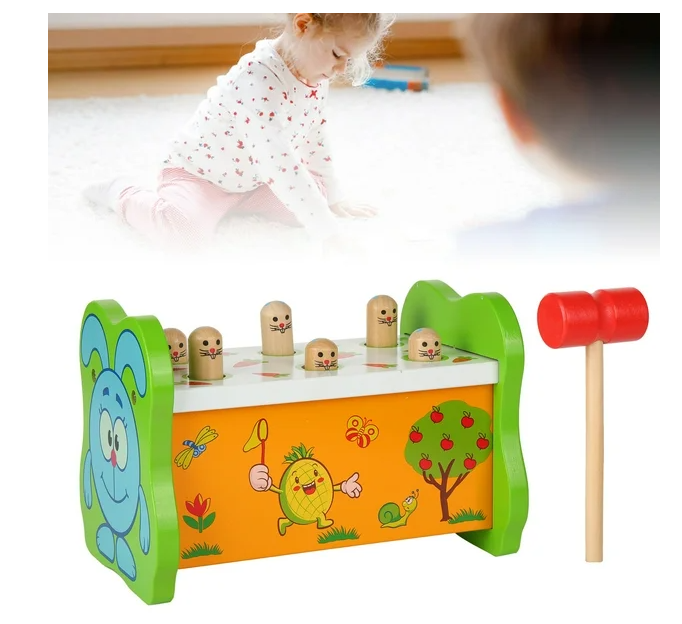 لعبة تعليمية خشبية للأطفال تحتوي على مطرقة صغيرة مع دبابيس للتحريك، تساعد على تنمية التناسق بين اليد والعين وتطوير المهارات الحركية الدقيقة.